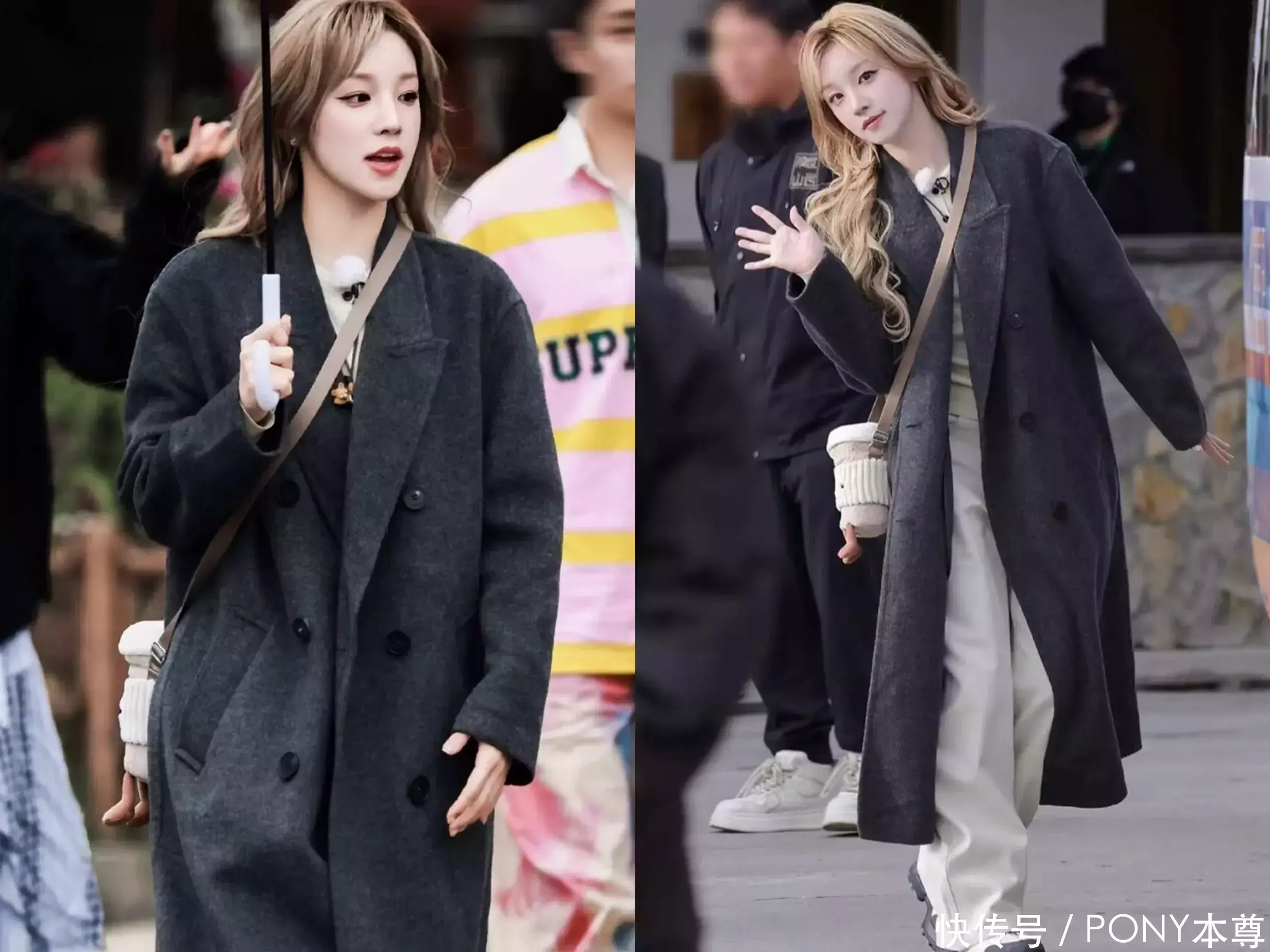 宋雨琦身上这款深灰色毛呢大衣,衣服立体感很强,翻领设计和双排口设计,让她看起来帅气时髦。宽松的版型对身材包容性好,而且还很休闲。